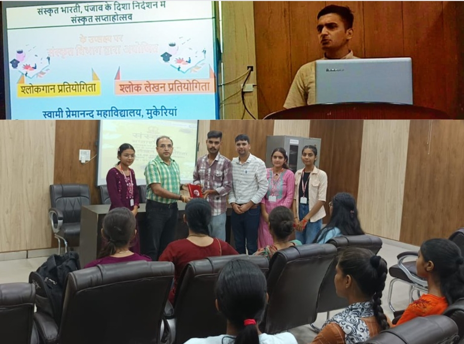 होशियारपुरजनपदे मुकेरीयानगरे स्वामीप्रेमानन्दमहाविद्यालये संस्कृतसप्ताहमहोत्सवस्य समापनं सफलतापूर्वकम् अभवत्। अस्मिन् विषये संस्कृतविभागस्य अध्यक्षः डॉ. गोपी शर्मा अवदत् यत् भारते प्रतिवर्षं श्रावणीपूर्णिमा-पवित्र-अवसरः संस्कृत-दिवसरूपेण आचर्यते। श्रावणी पूर्णिमा ऋषिणां ज्ञान-पूजन-समर्पण-उत्सवः इति मन्यते । अस्मिन् दिने गुरुकुलेषु वेदाध्ययनात् पूर्वं याग्योपवीतः धार्यते । संस्कृतभारती पञ्जाबस्य निर्देशने सौजन्ये च सम्पूर्ण पंजाबप्रान्ते बहूनि कार्यक्रमाणि प्रचलन्ति। अतः अस्मिन् कार्यक्रमे अपि पद्यगायनप्रतियोगिता, पद्यलेखनप्रतियोगिता च आयोजिता। तेन सह संस्कृत-वृत्तचित्रं विज्ञान-प्रदर्शनं च छात्राणां कृते प्रदर्शितम् । महाविद्यालयस्य प्राचार्य डॉ. समीर शर्मा मुख्य अतिथिरूपेण कार्यक्रमे उपस्थितः। अस्य कार्यक्रमस्य कृते संस्कृतभारती पञ्जाब कृते एवं संस्कृतविभागाय अभिनन्दनं कृत्वा संस्कृते एव अस्माकं मूलः इति उक्तवान् । वयं कदापि अस्माकं मूलतः विरक्ताः भवितुम् न शक्नुमः। भारतस्य प्रतिष्ठायां संस्कृतस्य संस्कृतेः च अतिमहत्त्वम् वर्तते । अद्य नैतिकमूल्यानां कृते संस्कृतस्य उपयोगिता अत्यावश्यकी। तदनन्तरं कार्यक्रमे सहभागिनां छात्राणां कृते प्रमाणपत्राणि वितरितानि। अन्ते संस्कृतविभागस्य अध्यक्षः डॉ. गोपी शर्मा महाविद्यालयस्य प्रबन्धनसमित्याः , एवं च विशिष्ट रूपेण संस्कृतभारती पंजाब इत्यस्य दिशानिर्देशनाय धन्यवादः कृतम्। अस्मिन् अवसरे समूहसंस्कृतविभागस्य छात्राः उपस्थिताः आसन्।